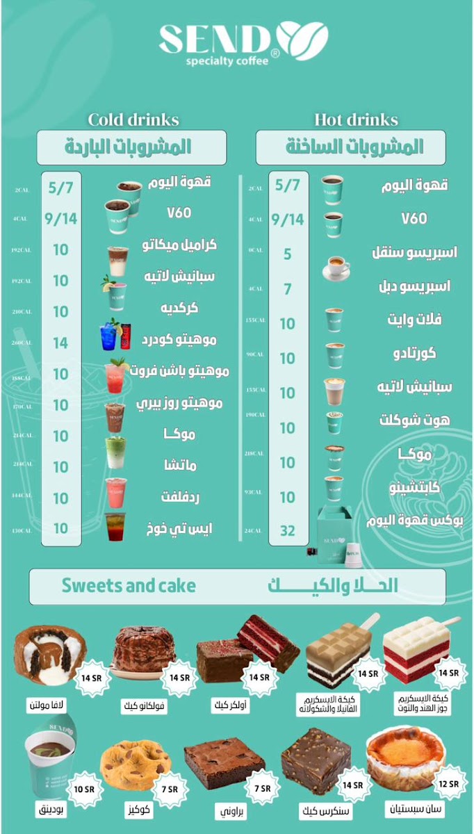 At Send Coffee, the menu features an impressive array of hot and cold beverages, each crafted with artistry and passion. The Spanish Latte (SAR 14.00), is a must-try: a delightful blend that marries rich coffee and frothy milk, elegantly served to satisfy your senses. For true coffee lovers, the Coffee of the Day (SAR 7.00) is a standout—prepared using the v60 method for a distinct and flavorful experience that will keep you coming back for more. If you prefer something more intense, the Double Espresso (SAR 6.90) promises a bold flavor that lingers on the palate, while the Flat White offers a smooth finish that’s equally delightful.